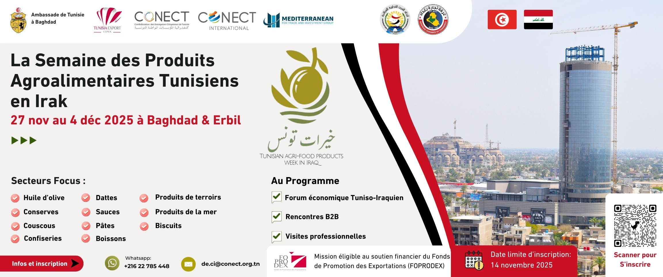 Participez à « La Semaine des Produits Agroalimentaires Tunisiens en Irak – خيرات تونس », du 27 novembre au 4 décembre 2025 à Baghdad & Erbil.